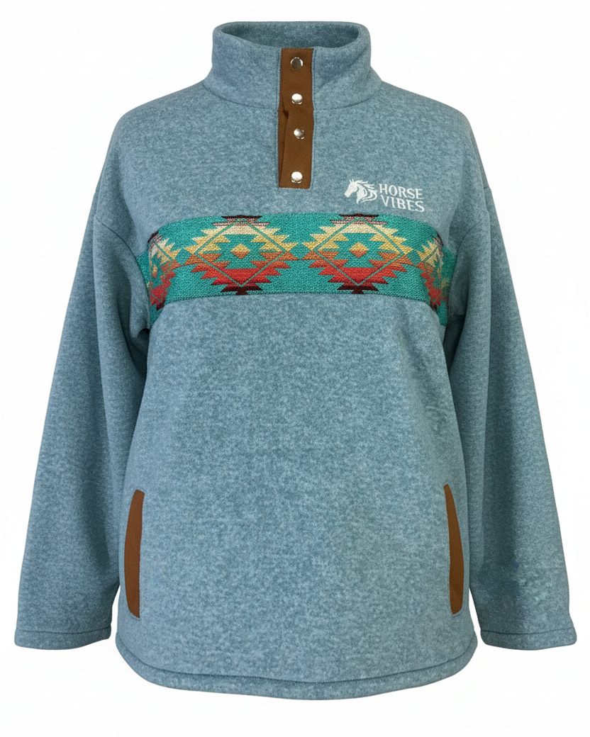 Discover the comfort of this hoodie made from soft fleece, perfect for lovers of Western style. It features a woven Aztec-patterned band across the chest. The stand-up collar with snap button provides both style and protection from the cold. Lined side pockets add a practical touch. An ideal choice for country style enthusiasts or for a cozy-chic everyday look. Colors and patterns may vary slightly.
