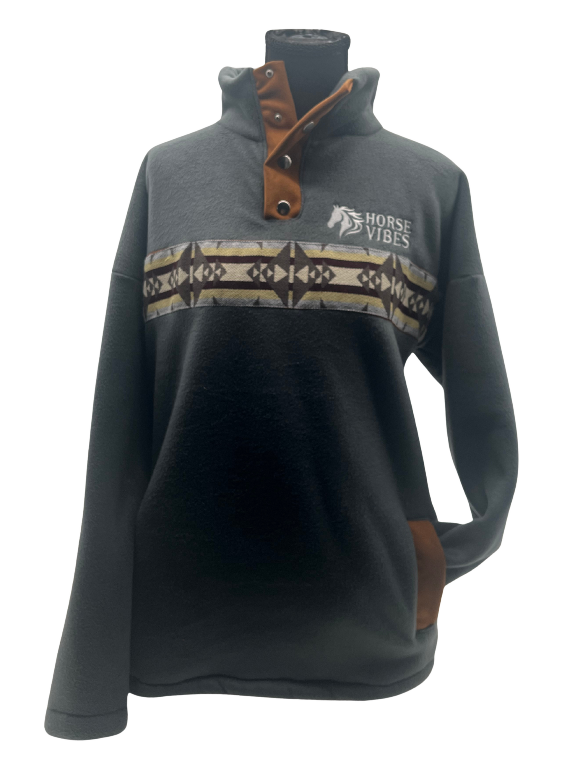 Découvrez le confort de ce hoodie fait en polar doux pour les amoureux de style western. Il se démarque par sa bande tissée à motifs aztèques placée à la poitrine. Son col montant avec bouton pression apporte à la fois style et protection contre le froid. Ses poches latérales doublées ajoute une note pratique. Un choix idéal pour les amateur de style country ou pour un look cozy-chic au quotidien. Les couleurs ou motifs peuvent variés légèrement.